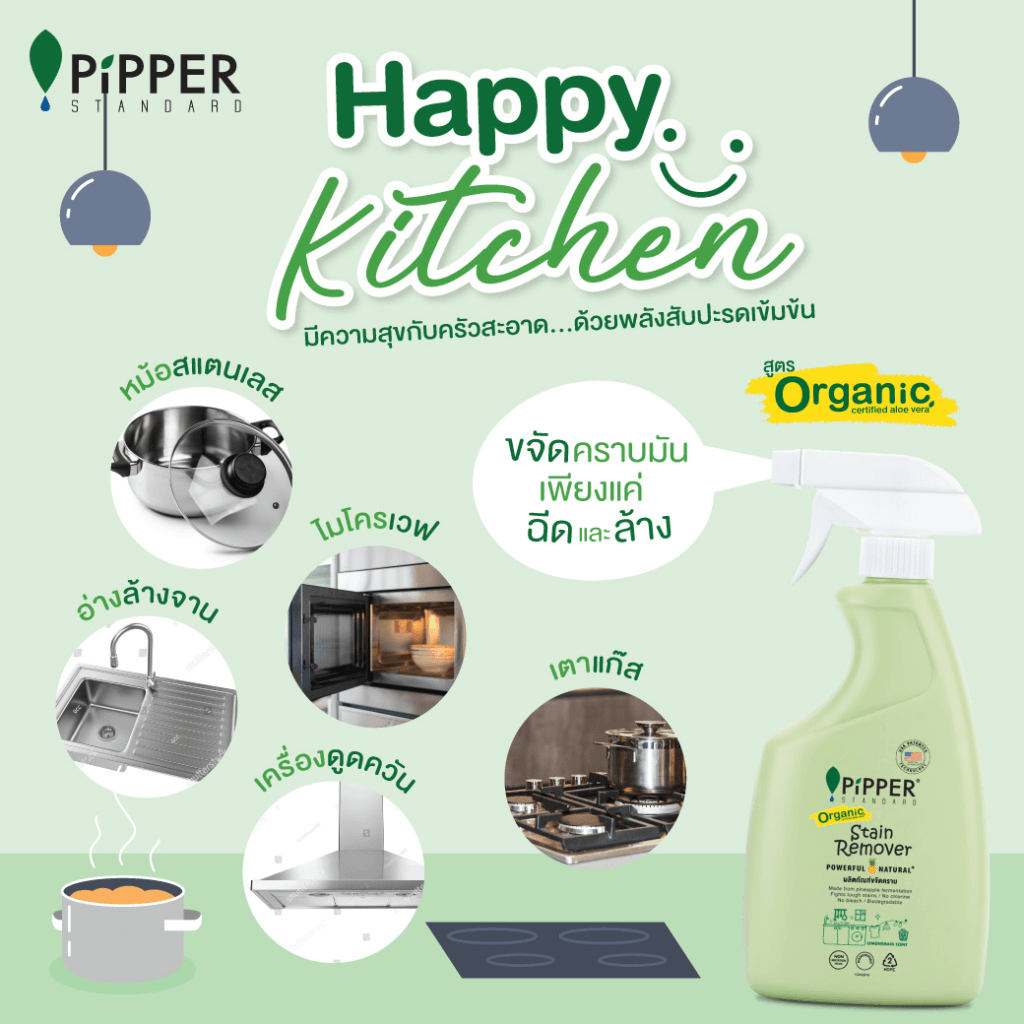 เมื่อใดที่ได้เห็นครัวสะอาด เมื่อนั้นก็อยากลุกมาสนุกกับการทำอาหาร จริงไหม พิพเพอร์ฯ ชวนคุณมามีความสุขกับครัวสะอาด เพียงแค่มีตัวช่วยที่เบาแรง อย่างนํ้ายาขจัดคราบ พิพเพอร์ สแตนดาร์ด ที่ช่วยขจัดคราบไขมัน คราบหนักฝังแน่น คราบสกปรกบนพื้นผิววัสดุที่ยากจะทำความสะอาดได้ เช่น