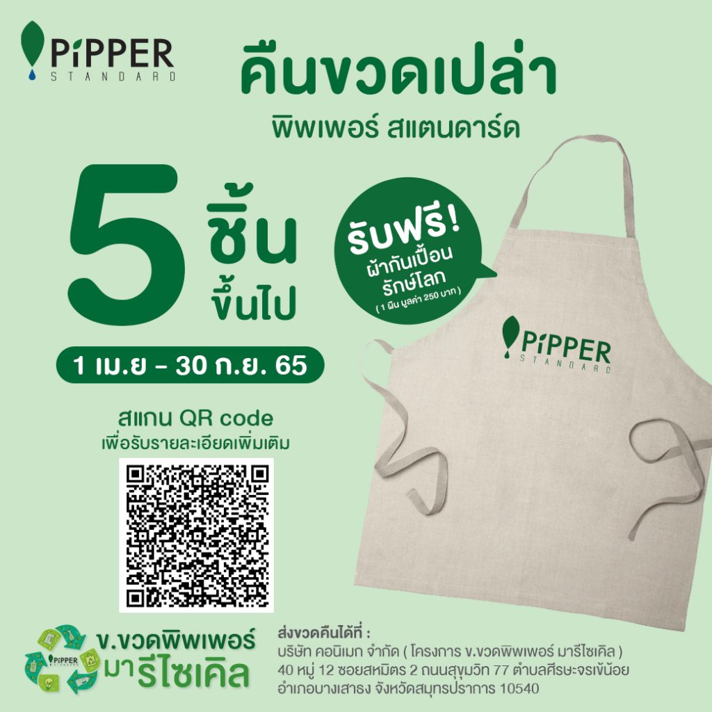 มาร่วมกันนำขวดพลาสติกใช้แล้วมารีไซเคิล กับ พิพเพอร์ สแตนดาร์ด ในโครงการ ข.ขวด พิพเพอร์ มารีไซเคิล ครั้งที่ 2 เพียงส่งขวดเปล่า พิพเพอร์ สแตนดาร์ด 5 ขวด รับไปเลย ผ้ากันเปื้อนรักษ์โลก 1 ผืน ( มูลค่า 250 บาท )
