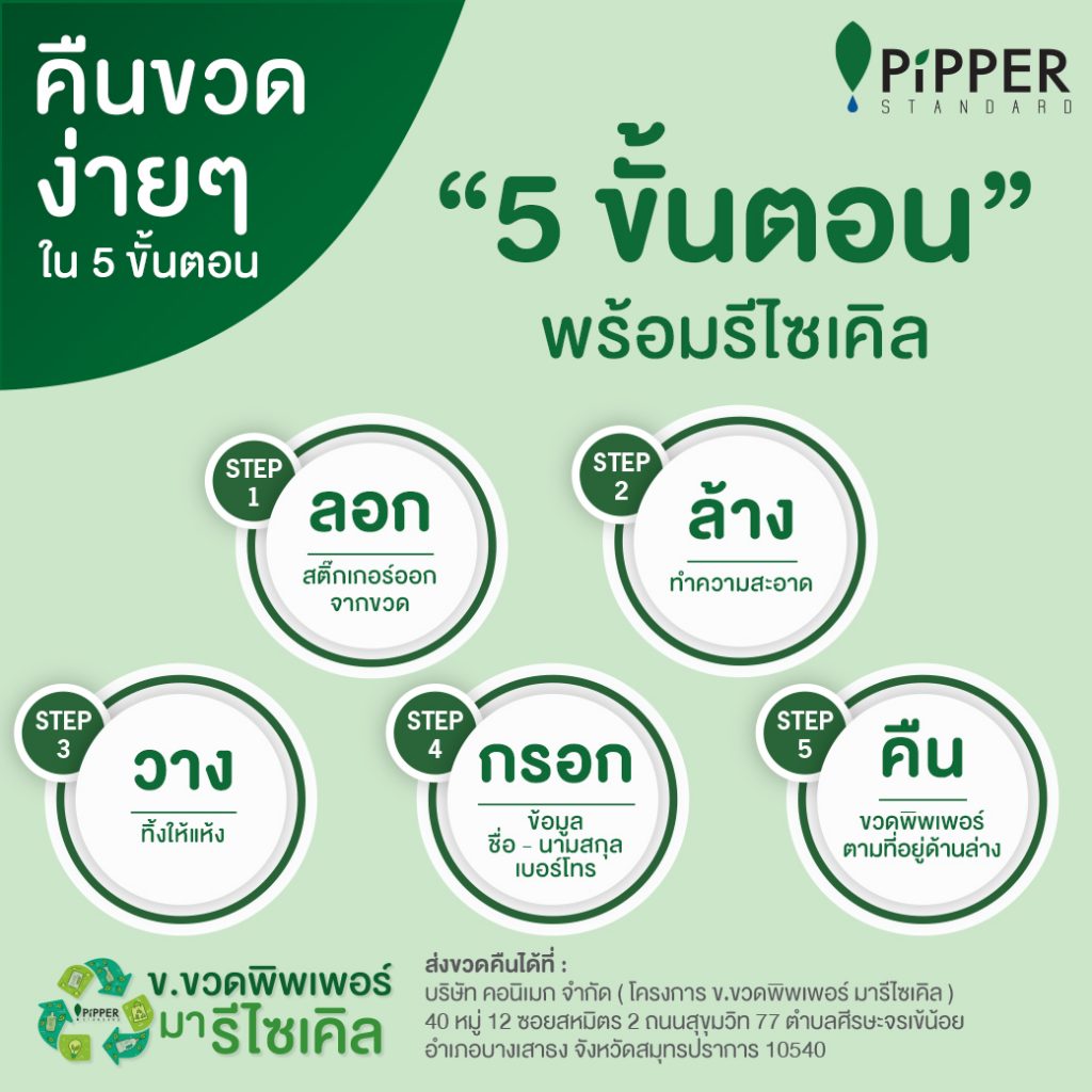 โครงการนี้มีจุดประสงค์หลักเพื่อร่วมอนุรักษ์สิ่งแวดล้อมและลดจำนวนขยะพลาสติดแบบใช้ครั้งเดียวแล้วทิ้ง โดยเรามีความตั้งใจจะนำเม็ดพสาสติกที่ได้รับจากโครงการข.ขวดพิพเพอร์ มารีไซเคิล นี้ไปขึ้นรูปเป็นบรรจุภัณฑ์พิพเพอร์ สแตนดาร์ดใหม่ เพื่อให้สีของบรรจุภัณฑ์พิพเพอร์มีความกลมกลืนและใกล้เคียงกับสีเดิมมากที่สุด เราจึงขอสงวนสิทธิ์รับเฉพาะขวดผลิตภัณฑ์พิพเพอร์ สแตนดาร์ด เท่านั้นค่ะ