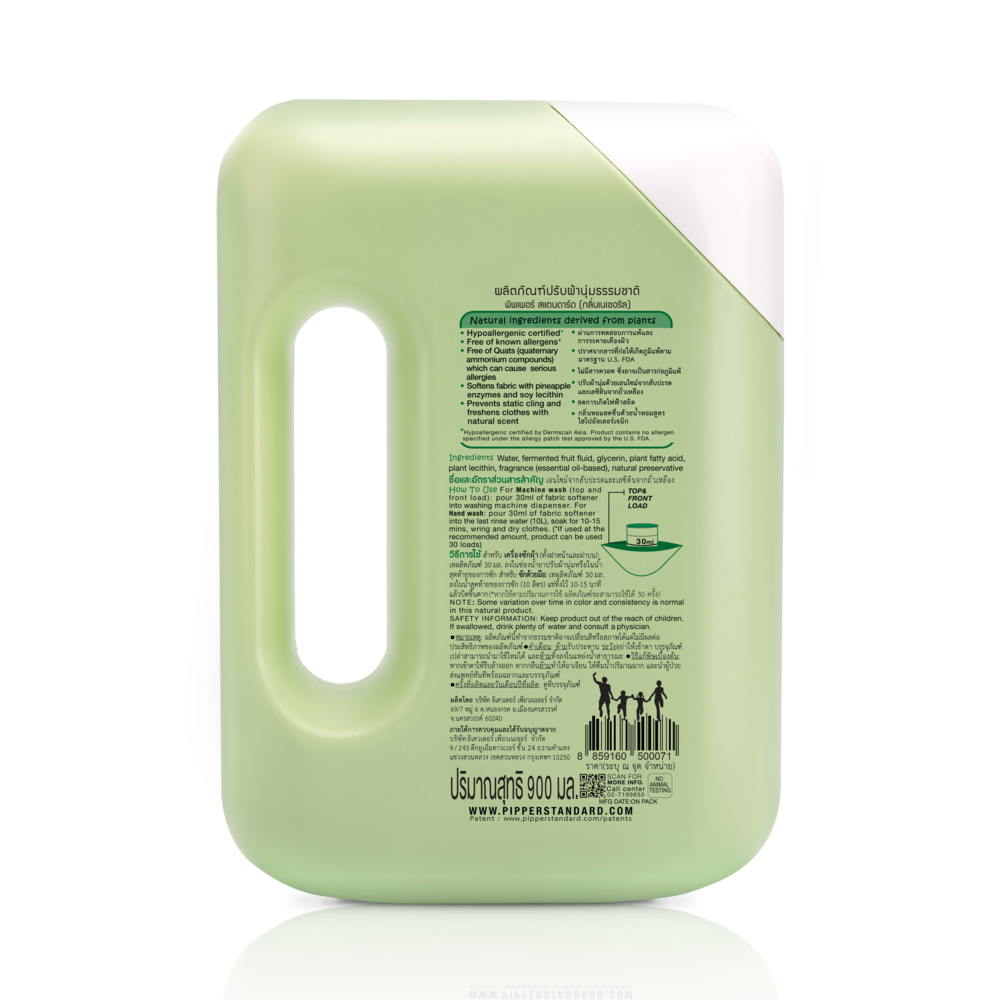 ผลิตภัณฑ์ปรับผ้านุ่มพิพเพอร์ สแตนดาร์ด ปราศจากสารควอท ปรับผ้าให้นุ่ม ฟู ลดการเกิดไฟฟ้าสถิตย์ จากสารสกัดธรรมชาติเลซิตินจากถั่วเหลือง และน้ำหมักสับปะรด พร้อมกลิ่นหอมอ่อนๆ จากน้ำหอมสูตรไฮโปอัลเลอเจนิกส์ ผ่านการทดสอบการแพ้และระคายเคือง และปราศจากสารก่อภูมิแพ้ตามมาตรฐานทรูเทสต์ ประเทศสหรัฐอเมริกาใช้ได้กับเสื้อผ้าเด็ก และผู้ใหญ่