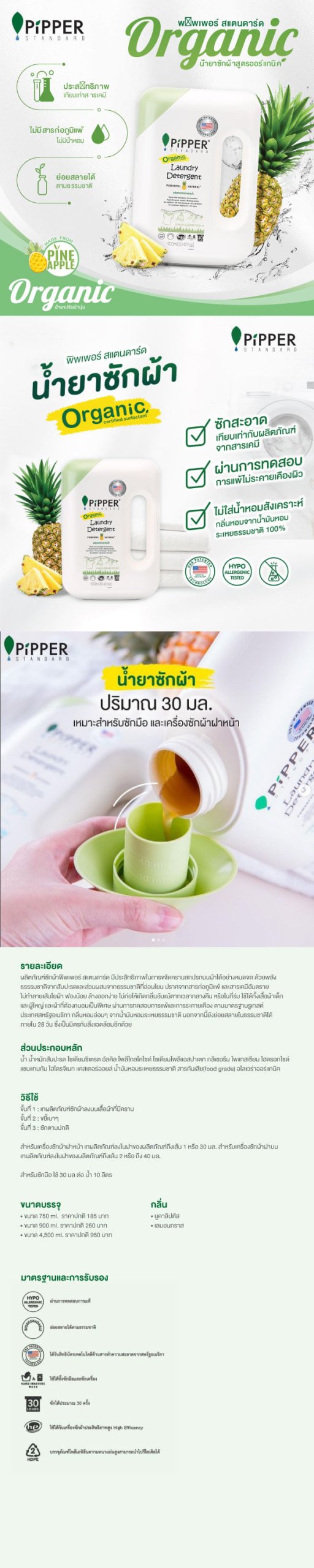 ผลิตภัณฑ์ซักผ้าพิพเพอร์ สแตนดาร์ด มีประสิทธิภาพในการขจัดคราบสกปรกบนผ้าได้อย่างหมดจด ด้วยสูตรธรรมชาติที่อ่อนโยน ไม่ทำลายเส้นใยผ้า ฟองน้อย ล้างออกง่าย ขจัดกลิ่นอับแม้ตากเวลากลางคืน หรือในที่ร่ม ใช้ได้ทั้งเสื้อผ้าเด็กและผู้ใหญ่ และผ้าที่บอบบาง ผ่านการทดสอบการแพ้และการระคายเคือง ปราศจากสารภูมิแพ้ กลิ่นหอมอ่อนๆ จากน้ำมันหอมระเหยธรรมชาติ นอกจากนี้ยังเป็นมิตรกับสิ่งแวดล้อมอีกด้วย