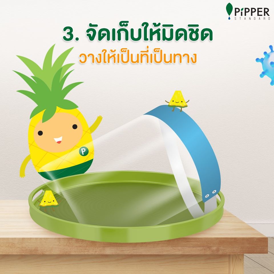 การจัดเก็บก็ควรจะเก็บให้มิดชิด และเป็นระเบียบ เพราะถ้าวางไม่เป็นที่เป็นทาง จากที่เราทำความสะอาดจนไม่เหลือเชื้อโรคแล้ว แต่เราดันไปวางกับของเยอะ ๆ ก็เสี่ยงที่ Face Shield ของเราได้รับเชื้อโรคมาจากของชิ้นอื่นได้ และเมื่อนำมาใส่ต่อ ก็อาจจะกลายเป็นผลเสียมากกว่าผลดีอย่างแน่นอน