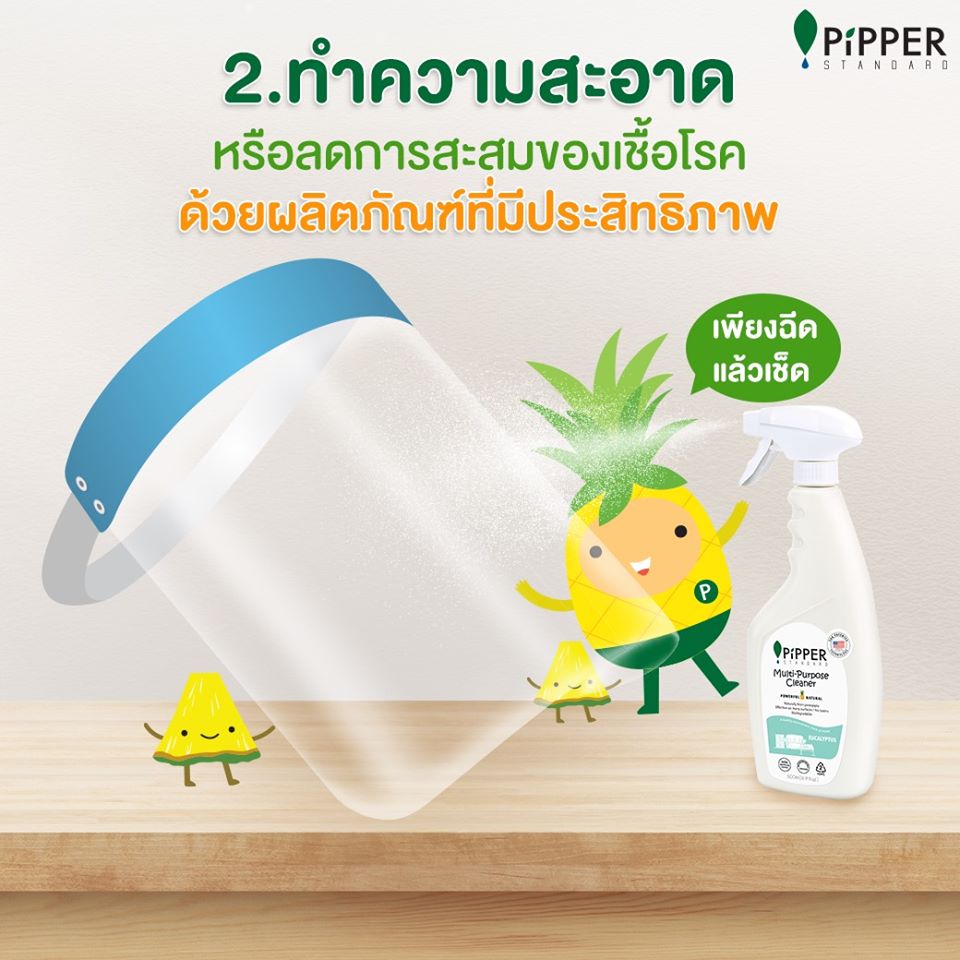 🍍สะอาด ลดการสะสมของเชื้อโรค 🍍 เพียงฉีดและเช็ดลงบนพื้นผิวต่าง ๆ ไม่ว่าจะเป็นหน้าจอโทรศัพท์ ลูกบิด หรือแม้แต่ Face Shield ที่สัมผัสกับสารคัดหลั่งต่าง ๆ ก็สามารถให้ 💚PiPPER Multi-Purpose Cleaner💚 ทำความสะอาดได้แบบไม่ต้องกลัวสารเคมีตกค้างเลย และไม่ระคายผิวอีกด้วย